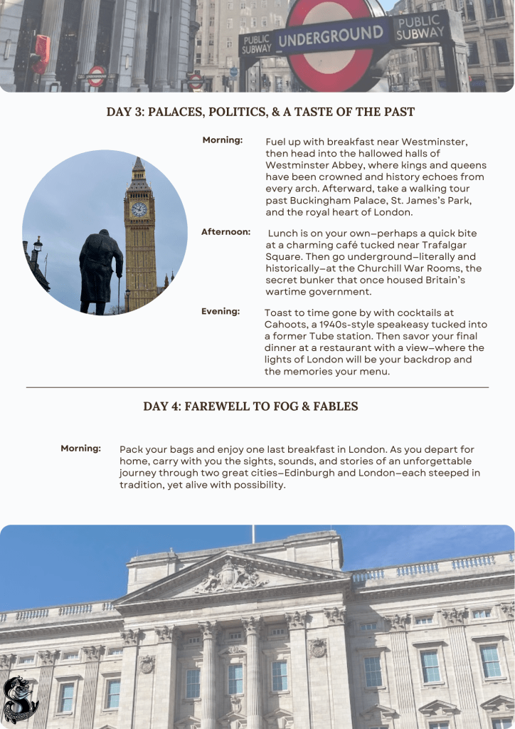 Step into the heart of England’s capital on a four-day escape that reveals London at its most iconic and intimate. From tranquil strolls through Hyde Park to the storied walls of the Tower of London, each day offers a new chapter in the city’s rich tapestry. Explore royal landmarks, secret wartime bunkers, and world-class theatre—all while savoring cozy meals, classic cocktails, and unforgettable views. Whether you’re drawn to history, culture, or a touch of pageantry, this is London, uncovered and unforgettable.
